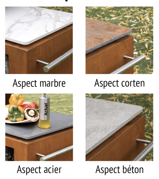 Le plan de travail en céramique facilite les préparations et découpes. Il est facile à entretenir et vous disposez de 4 finitions au choix : aspect acier, aspect corten, aspect marbre, aspect béton.